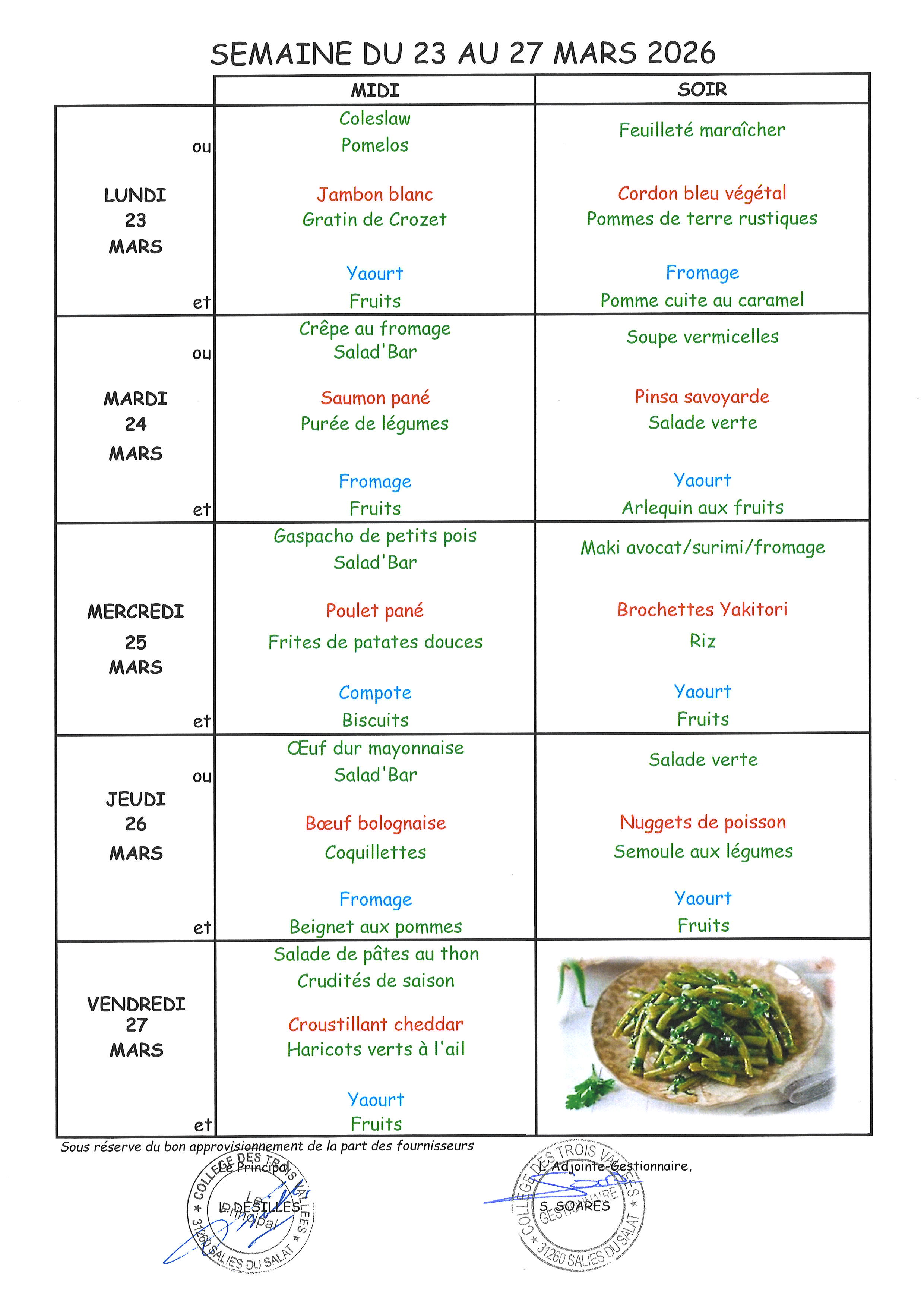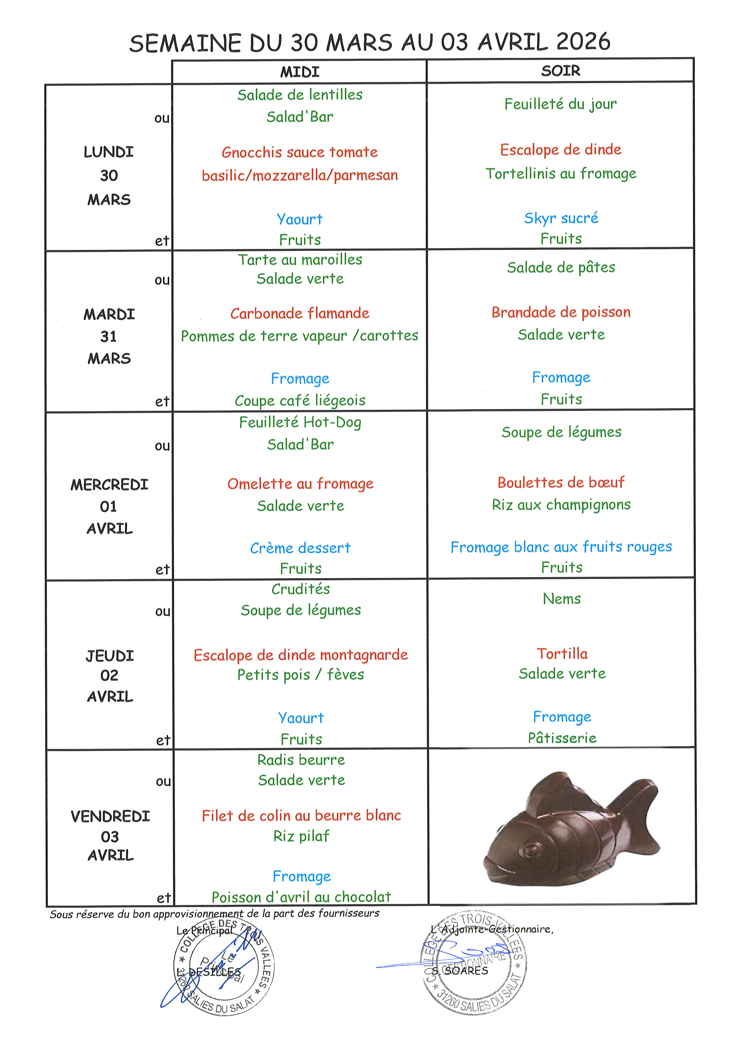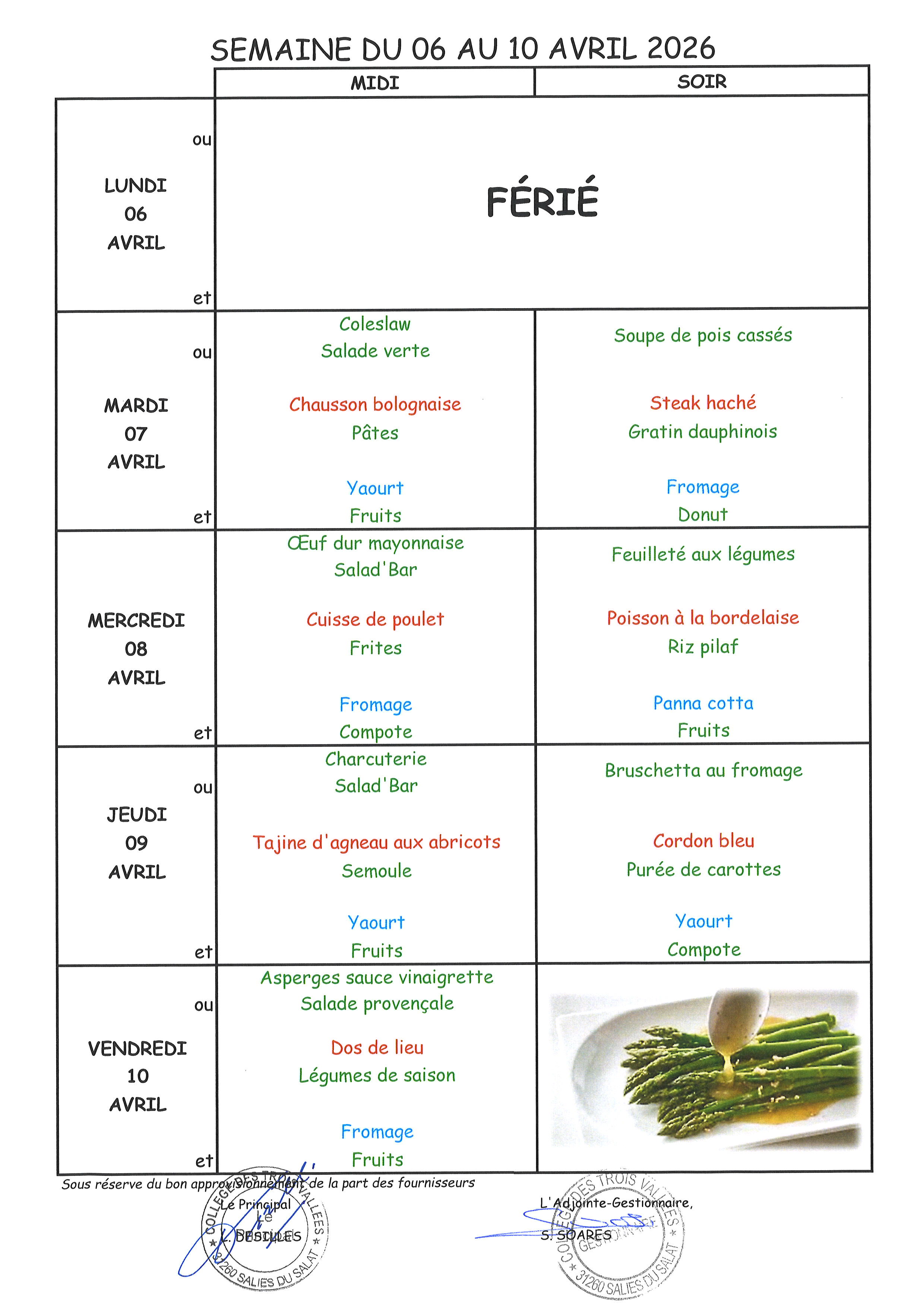 Menus du 16 mars au 10 avril 2026